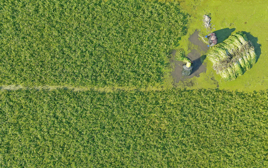 江苏省海安市墩头镇长垎村水芹菜扶植基地,菜农在水田庐采收水芹菜 图片来源:新华社