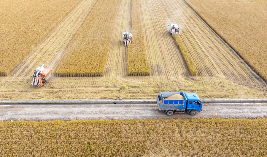 江苏省南通市通州区石港镇四港村农民驾驶收割机抢收水稻 图片来源:新华社